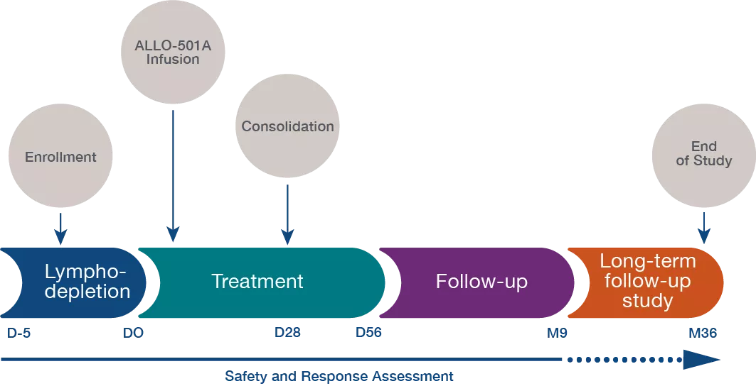 ALLO-501A是基于AlloCAR TTM的首批在研產(chǎn)品之一。該療法為抗CD-19 AlloCAR TTM。2020年6月,ALLO-501A開(kāi)始了ALPHAI/II期臨床。