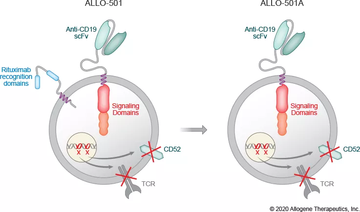 ALLO-501A是ALLO-501的進(jìn)化產(chǎn)品,其區(qū)別在于消除了ALLO-501中利妥昔單抗識(shí)別域。