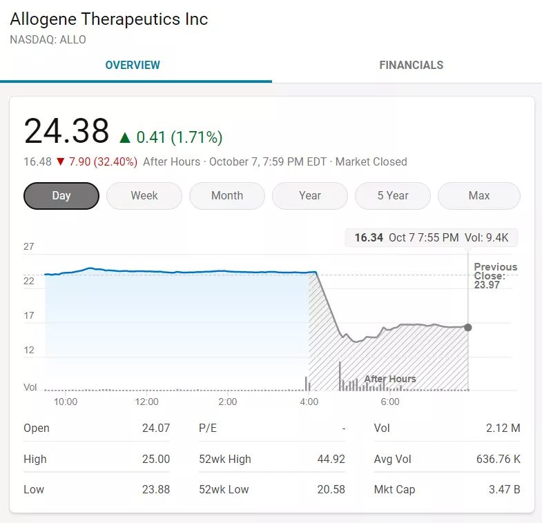受此利空影響,Allogene盤(pán)后暴跌超30%,市值蒸發(fā)10億美元。